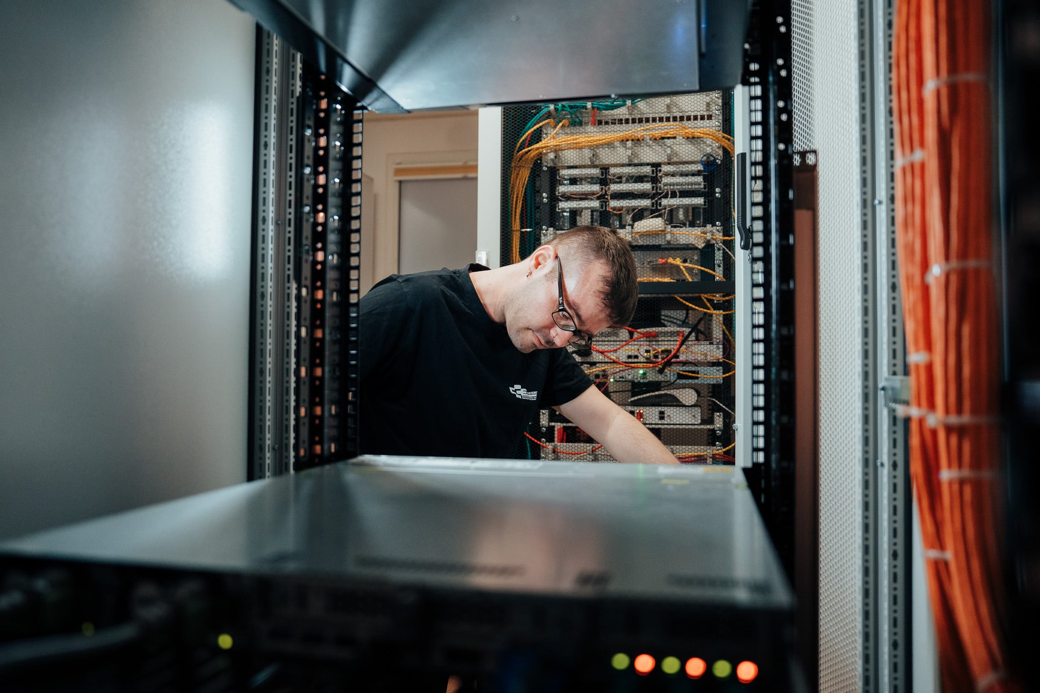 Ein Mann mit kurzen grauen Haaren und schwarzem T-Shirt steht in einem Serverraum, hält einen Laptop in der Hand und blickt leicht nach oben, umgeben von Serverschränken und moderner Netzwerktechnik, die auf eine robuste IT-Infrastruktur hinweist.